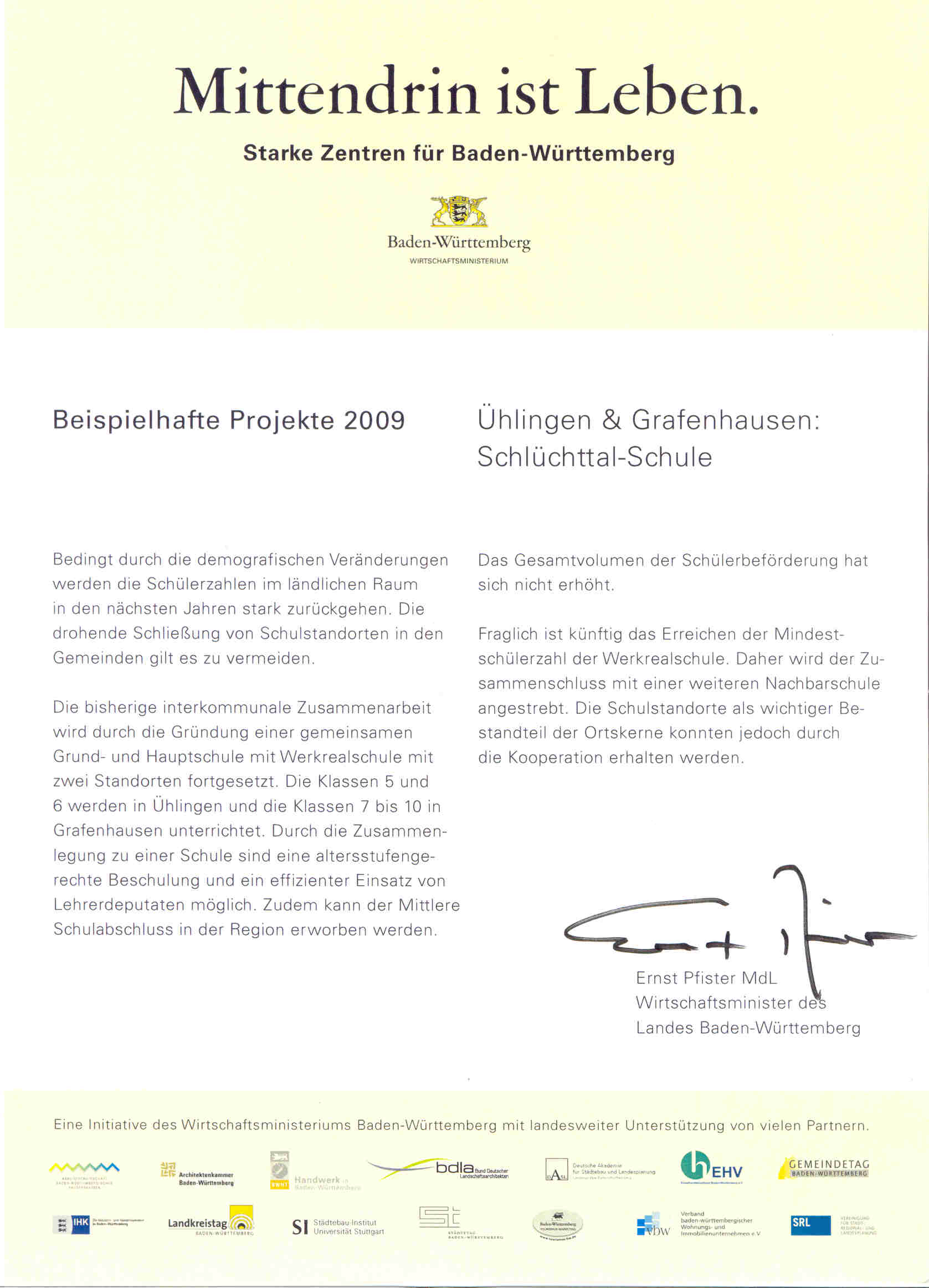 Auszeichnung des Schulverbundes durch Wirtschaftsminister Pfister im Rahmen der Initiative "Mittendrin ist Leben - Starke Zentren für Baden-Württemberg" in Stuttgart.