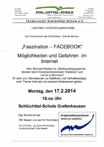 Vortrag des Fördervereins"Faszination Facebook -Möglichkeiten und Gefahren im Internet"Referent: Herr Michael Weeber (Kreismedienzentrum) | 17.02.14 WRS Grafenhausen Musiksaal ![]() |