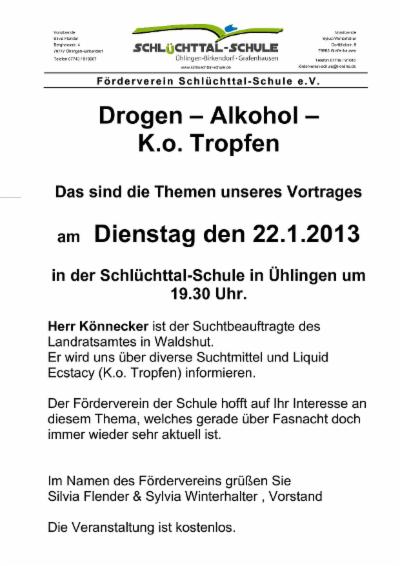 Vortrag des FördervereinsHerr Könnecker, Suchtbeauftragter des Landratsamtes Waldshut, referiert und informiert über das Thema:DROGEN - ALKOHOL - K.O.-TROPFENEinladung ![]() | ![]() |