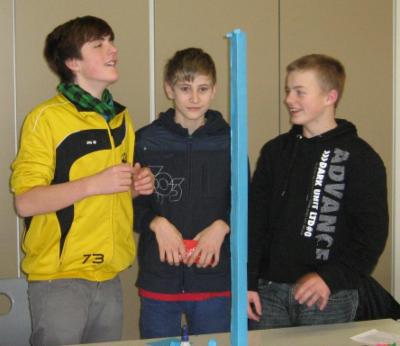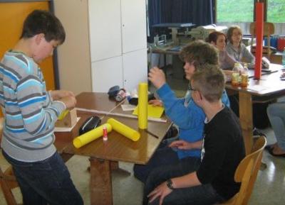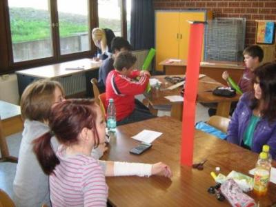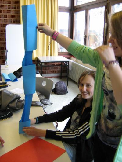 Gruppenarbeit: Die Schüler/innen bauen in Dreiergruppen aus 2 Blatt DIN-A3 Papier mit Klebstoff und Schere einen mindestens 1 m hohen Turm, der eine Minute lang bei Windstille stehen bleiben soll. Abschlusskriterien am Ende waren: höchster Turm, schönster Turm und stabilster Turm (sollte 100 g Gewicht tragen). | ![]() ![]() |