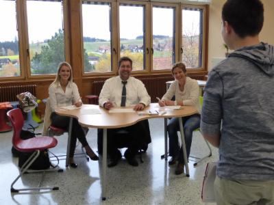 In drei Phasen wird unter Beteiligung von der Andreas Probst (Filialleiter Grafenhausen) ein Einstellungsverfahren zu einem kaufmännischen Beruf simuliert. Die Schüler der 8. Klasse bekommen individuelle Einschätzungen als Rückmeldung.