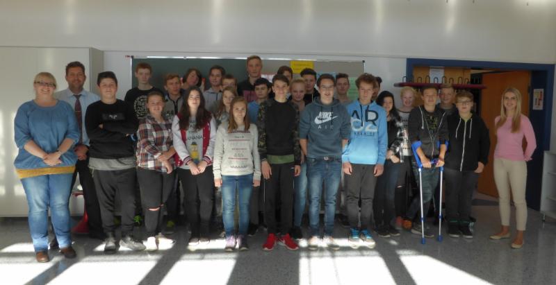 Die Klasse WRS 9 nach Abschluss des Assessmentcenters am 29.10.16 mit Andreas Probst und Anna Rutschmann (3. Lehrjahr und Ausbildungsbotschafterin)